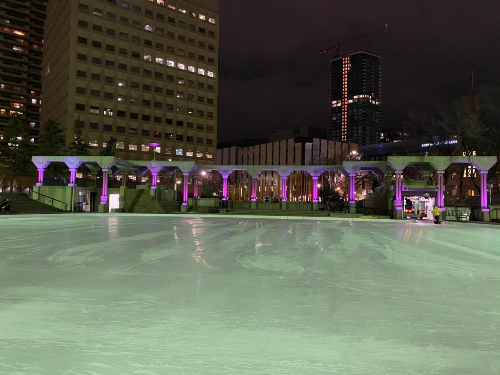 The second was Olympic Plaza downtown. This ice surface is surrounded by tall apartment buildings, beautiful lights and features a view of the Calgary Tower. The ice is also cleaned regularly, making it a good place to show off your tricks. There are also many restaurants in this area, making it a great place to stop for a meal and a skate.